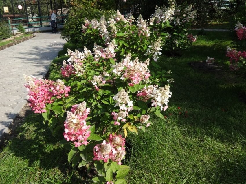 Гортензии метельчатые, например, сорт Ванилла Фрейз, имеют невысокие кустики, достигающие 1,2-1,5 метра в высоту. Они поражают воображение своими большими соцветиями, которые в начале цветения сияют белизной, а затем постепенно становятся ярко-розовыми. Полное цветение гортензии вызывает восхищение, когда все лепестки окрашиваются в розовые тона.