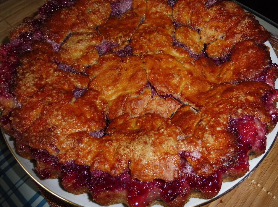 Бабушка часто готовила по несколько пирогов одновременно, используя простое тесто с ягодами, яблоками и тыквой. Времени на изысканные украшения у нее не было, поэтому она бросала кусочки теста прямо на начинку. Сковорода перед выпеканием покрывалась сливочным маслом и манной крупой, что позволяло тесту равномерно запечься, создавая хрустящую корочку с великолепным золотистым оттенком и пропитанную ароматным ягодным сиропом.