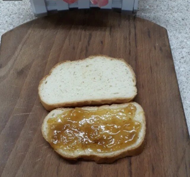 Процесс приготовления невероятно прост. Сначала нарезается хлеб на ломтики толщиной около 1 см. Один из них щедро намазывается густым джемом — можно использовать любой по вкусу, но предпочтение стоит отдавать более плотным разновидностям, таким как повидло.