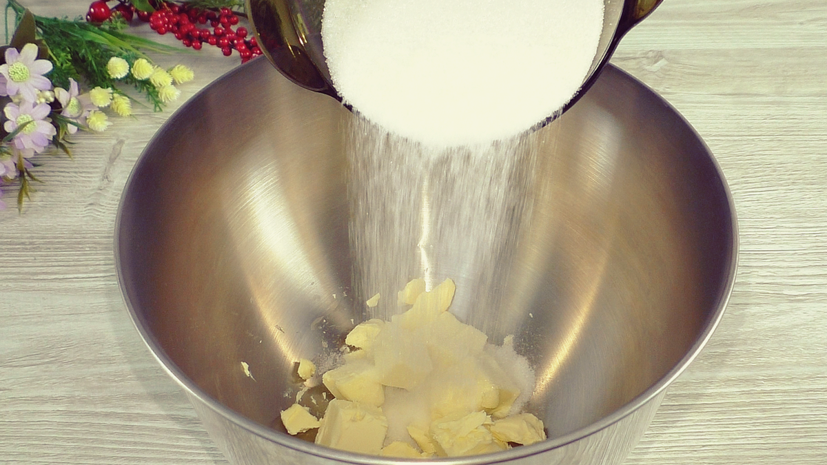 Для приготовления теста можно использовать планетарный миксер, обычный миксер или же замешивать вручную с помощью лопатки. Венчик в данном случае не подойдёт. В чашу следует добавить мягкое сливочное масло и сахар, затем добавить ванильный сахар и тщательно перемешать.