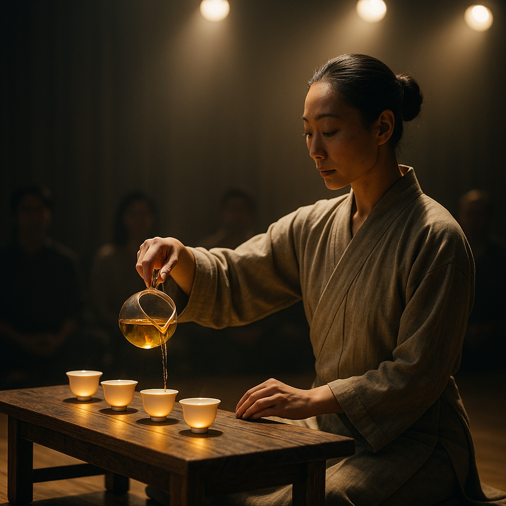 Мастер становится актером: его каждое движение тщательно продумано, а жесты составляют целостную композицию. Однако в отличие от традиционного театра, зрители активно участвуют — пробуют чай и становятся частью процесса.
