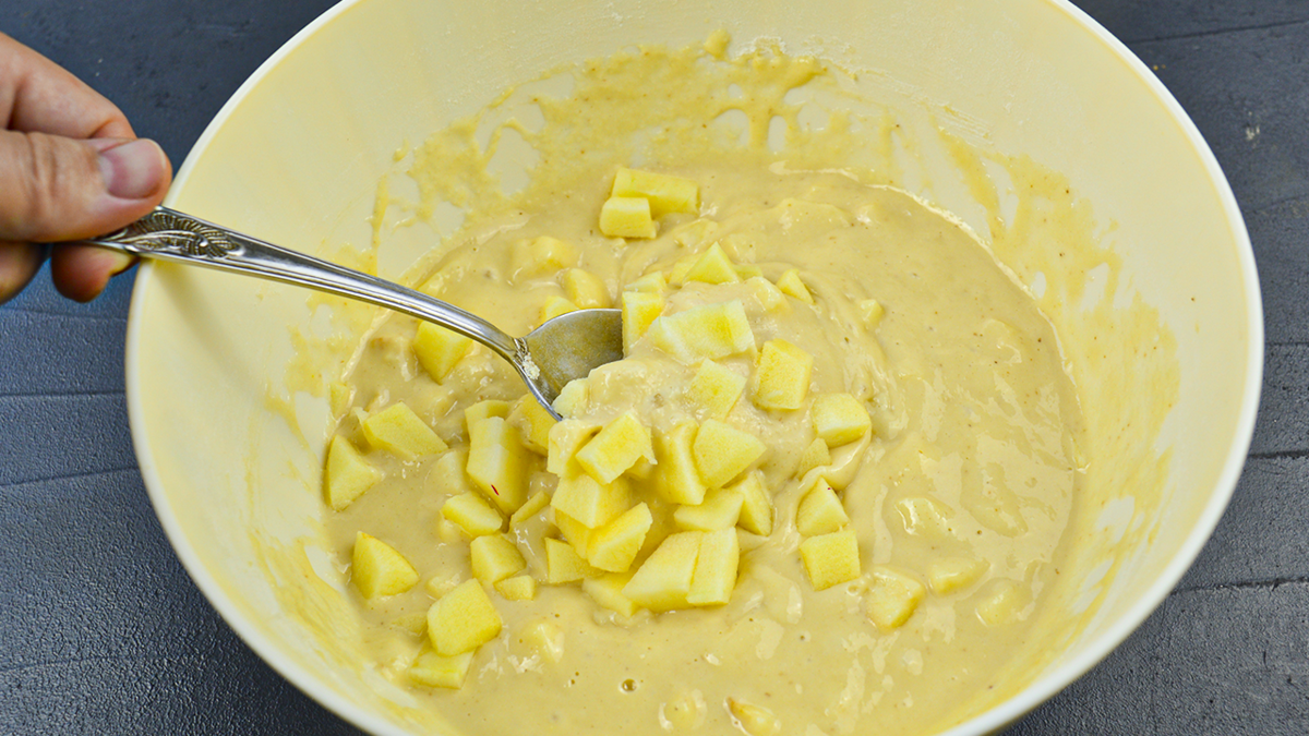Следующий шаг — добавление разрыхлителя или соды. После этого нарежьте очищенные яблоки кубиками и отправьте их в тесто. Тщательно перемешайте.