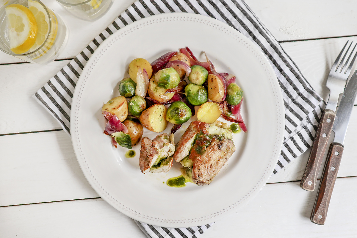Шаг 1: Разогрейте духовку до 200°C. В кастрюле вскипятите 2 литра подсоленной воды. Не очищая, тщательно промойте картофель и положите его в кипящую воду. Готовьте в течение 10 минут, затем добавьте брюссельскую капусту и продолжайте варить еще 5 минут. Слейте воду и остудите картофель, затем нарежьте его пополам. Пока овощи варятся, подготовьте свиную вырезку, разрезав ее на две части. Сделайте длинный надрез, оставив одну сторону закрытой, чтобы сформировать кармашек. Посолите и поперчите мясо снаружи и изнутри, смажьте его соусом песто и положите моцареллу. Фиксируйте все зубочистками.