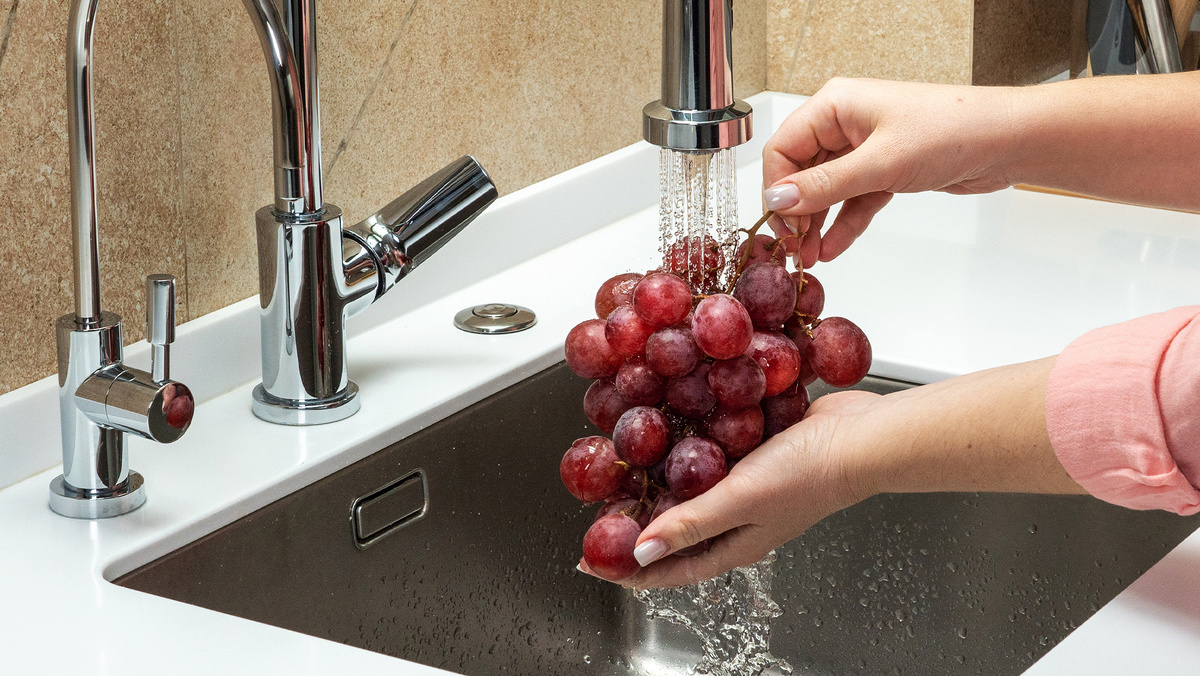 - Виноград: мыть гроздья винограда можно прямо в упаковке, не отделяя ягоды от веточек. Достаточно промыть гроздь под струей воды со всех сторон для удаления грязи и микробов.