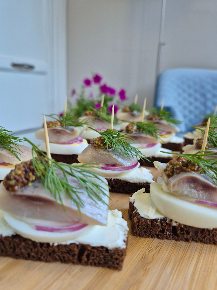5. Ржаной хлеб нарежьте на кусочки, подходящие по размеру к кусочкам селедки.