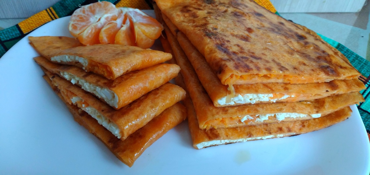 Затем лепешки обжариваются на сухой сковороде по 2-3 минуты с каждой стороны на среднем огне. После жарки их обильно смазывают растопленным маслом, накрывают пленкой и салфеткой. Это обеспечит дополнительную сочность и позволяет начинке лучше соединиться. Через 5 минут лепешки готовы к сервировке — их нарезают и подают на стол.