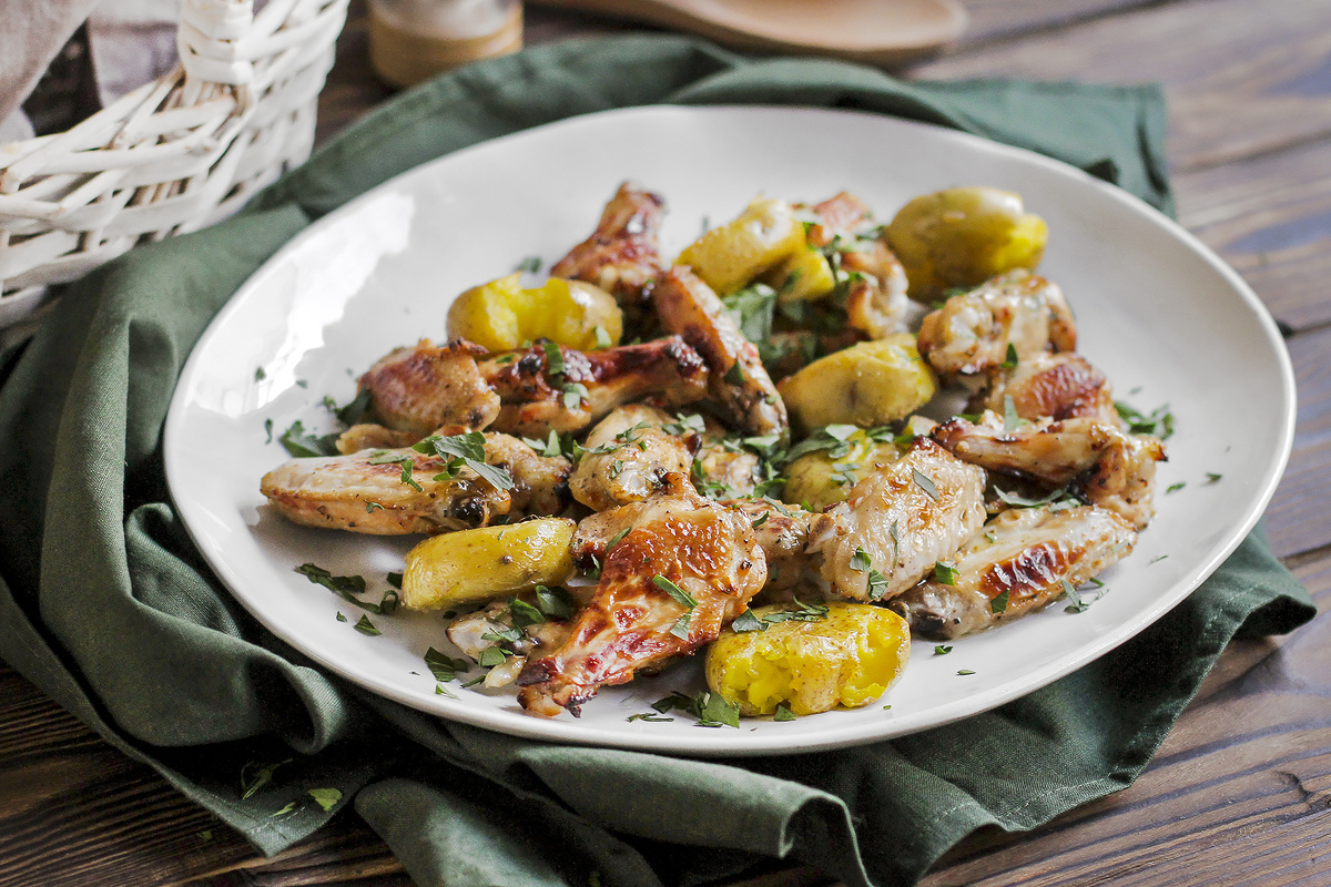Шаг 4: Готовый картофель выложите на доску и слегка придавите ножом. Подавайте куриные крылышки сразу же с картофелем и кетчупом. Приятного аппетита!