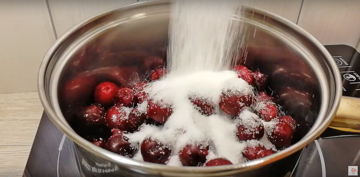 Первым делом нужно подготовить вишню. Замороженные ягоды идеально подходят для этого рецепта! Для быстроты можно разморозить их на плите, добавив немного сахара и ванильного сахара. В результате получится много сока — именно то, что необходимо для пирога.