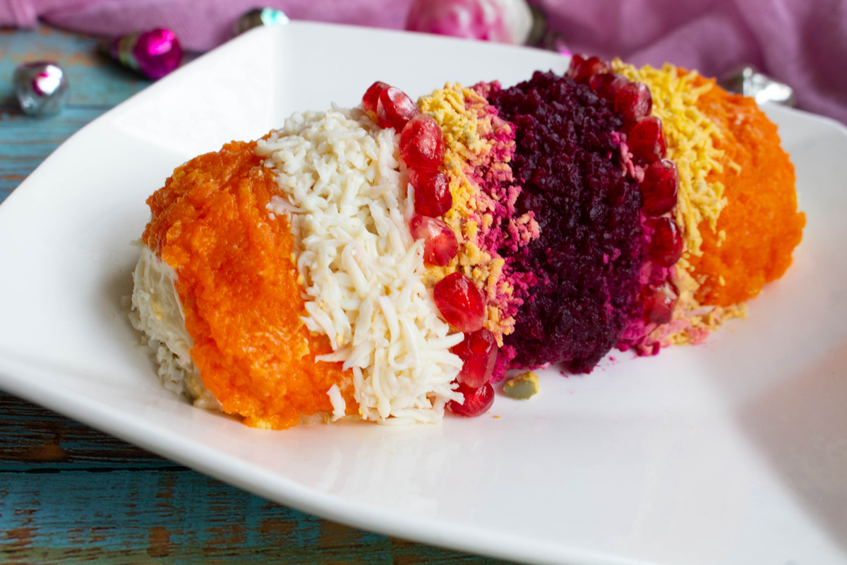 Салат аккуратно сворачивается в рулет с помощью пленки и охлаждается перед подачей. Далее его выкладывают на большую тарелку, обильно смазывают майонезом и украшают тертым белком и морковью. Полоски из желтков и свеклы добавят красок и разнообразия. Зерна граната можно использовать для дополнения узоров.