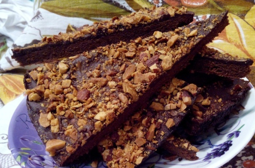 - Заливка: 100 г темного шоколада, 40 г сливочного масла, 40 г любых орехов (рекомендуется миндаль).