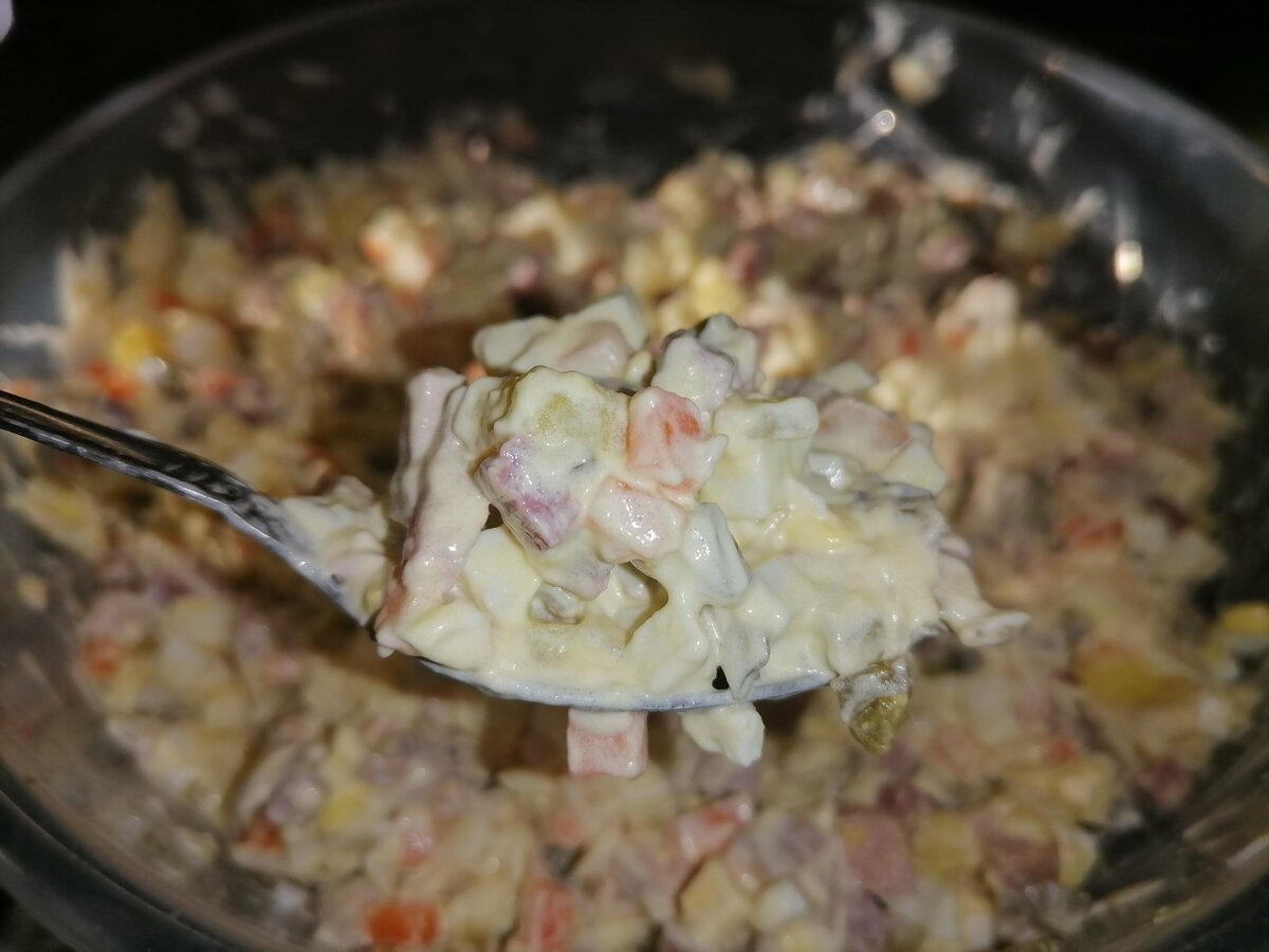 Лук и маринованные огурцы следует добавлять в самом начале. Так повелось в кулинарии, и хотя объяснение этому может быть неочевидным, оно стало традицией. К тому же, не забудьте добавить соль до майонеза: так она лучше растворится и равномерно распределится по всем ингредиентам. Для интересного вкусового эффекта в майонез можно добавить половину чайной ложки сахара и немного растительного масла. Это создаст баланс между соленым, сладким и кислым.