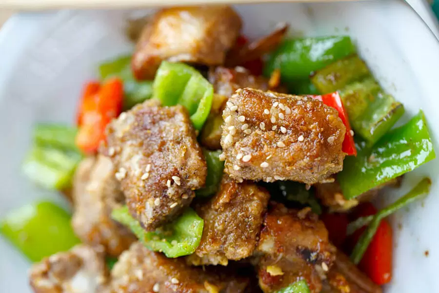 Нарезать ребрышки на кусочки по 3-4 см и замочить в воде на 15 минут.Порезать зеленый и болгарский перцы на небольшие кусочки.Слить воду, переложить ребрышки в кастрюлю, добавить шаосинское вино, пару стрелок зеленого лука и несколько пластинок имбиря, залить водой. Довести до кипения и варить на медленном огне 10 минут. Оставить настояться под крышкой.Измельчить чеснок и оставшийся имбирь, нарезать оставшиеся стрелки зеленого лука.Слить отваренные ребрышки через дуршлаг, переложить в миску и добавить соль, сахар, светлый соевый и устричный соусы. Хорошо перемешать и оставить на 10 минут. Обвалять в кукурузном крахмале перед жаркой.Разогреть масло на сковороде и обжарить ребрышки до золотистой корочки с обеих сторон.Сдвинуть ребрышки на одну сторону, добавить чеснок, имбирь и сушеный чили, обжарить до аромата.Добавить нарезанные перцы и жарить еще, помешивая, до мягкости. Приправить специями, добавить кунжут и зеленый лук, хорошо перемешать и снять с огня.Приятного аппетита!