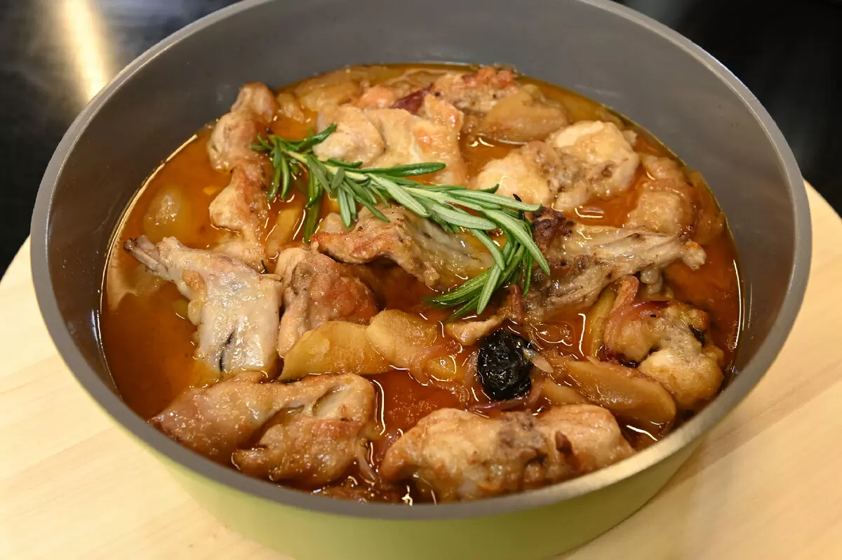 Начать следует с того, что тушку кролика надо разделать на порционные кусочки, удалив лишний жир и пленку. Затем подготовленные куски поместить в глубокую емкость и посолить.Очищенный красный лук нарезать тонкими перьями, а яблоки — на дольки, предварительно продув сердцевину.На сковороде растопить сливочное масло с оливковым. Кусочки кролика обвалять в муке и обжарить на среднем огне до золотистой корочки. Готовые куски переложить в форму для запекания.В оставшемся на сковороде масле обжарить красный лук, посыпав его коричневым сахаром для карамелизации. При добавлении бальзамического уксуса и дольки яблок, слегка обжарить смесь, затем выложить к кролику.В сковороду влить белое вино, добавить воду, горчицу и мед. Довести до кипения и влить этот ароматный соус к кролику с яблоками.Поверх блюда разместить чернослив, приправить паприкой и жгучим перцем, чуть посолить и тщательно перемешать. Сверху положить веточку розмарина, накрыть форму фольгой и отправить в разогретую до 180°С духовку на 1 час.По истечении времени аккуратно снять фольгу и оставить кролика в духовке еще на 30 минут. Блюдо готово к подаче! Приятного аппетита!