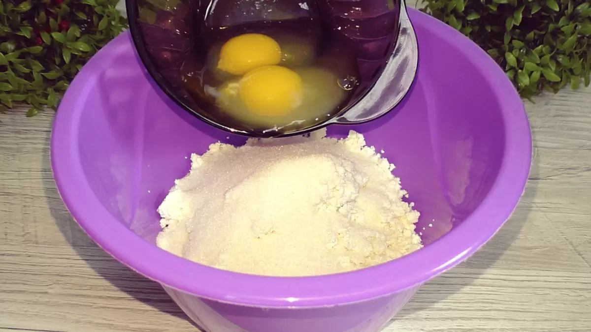 Приготовление этой запеканки не занимает много времени и сил. Начните с того, что в миске смешайте творог с щепоткой соли и сахаром. Следом введите яйца и тщательно перемешайте.