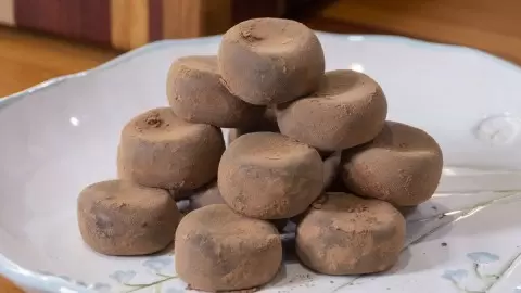 Когда масса будет готова, покройте дно и стенки пластикового контейнера пищевой пленкой и вылейте ее туда. Сверху также накройте пленкой и отправьте в холодильник на минимум полтора часа для застывания. Как только конфетка затвердеет, нарежьте ее на небольшие кусочки по 15 граммов, сформируйте шарики и обваляйте их в какао-порошке. Подавайте на красивой тарелке, посыпав сверху еще немного какао.