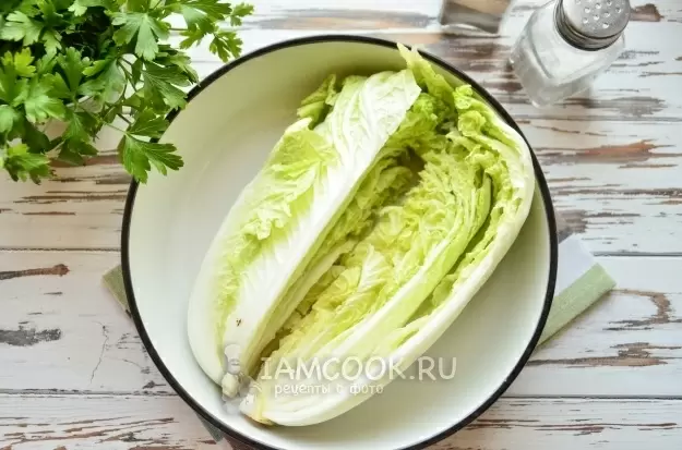 - Пекинская капуста (70 г) — берется по возможности из верхней части, где листья более волокнистые и сладкие. Их тонко нарезают для нежности и хрустящей текстуры.