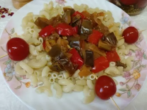 По истечении 5 минут макароны будут готовы. Их нужно выложить на тарелку и сверху щедро добавить овощную смесь. Для украшения подойдет пара консервированных помидоров, придающих цвет и свежесть.