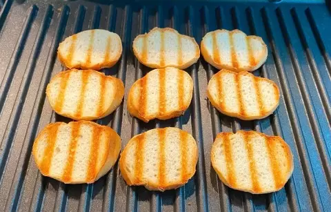 Рекомендуется взять багет, нарезать его на небольшие ломтики и немного подсушить на гриле или сухой сковороде. Такой подход не только улучшает вкус, но и помогает шпажкам крепко держаться в хлебе, так как мягкий мякиш может затруднить эту задачу.