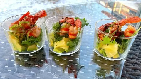 Следует быть осторожным, поскольку лангустины и креветки готовятся моментально, и пережаривание приведет к жесткому мясу. Пока морепродукты остывают, можно подготовить другие ингредиенты. Авокадо нарезается на кусочки и сбрызгивается лимонным соком для предотвращения потемнения. Ананас также нарезается и добавляется в салатники вместе с предварительно промытой руколой.