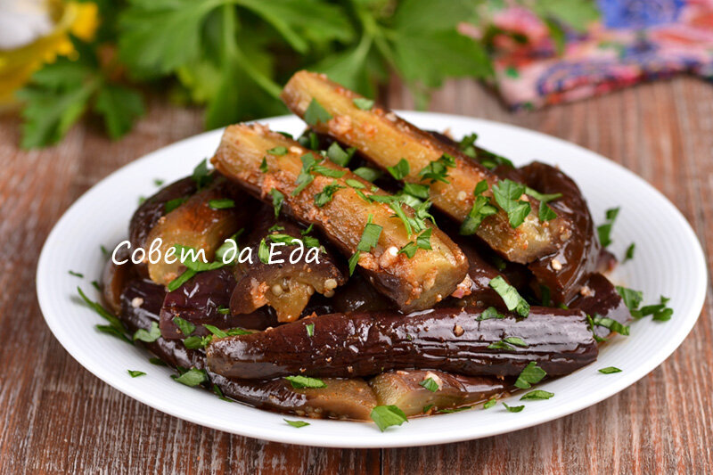 6. После маринования подавайте баклажаны на стол, посыпав их оставшейся петрушкой. Эта закуска идеально сочетает в себе хрусткость и насыщенные вкусы, прекрасно дополняя любые основные блюда.