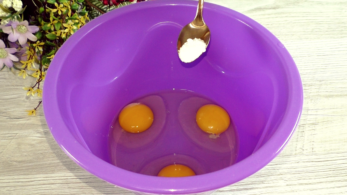 В глубокой миске соединить яйца, сахар и соль. Соль можно варьировать в зависимости от того, насколько солёные ваши сыр и колбаса. Обязательно добавьте сахар — это важный элемент для балансировки вкуса.