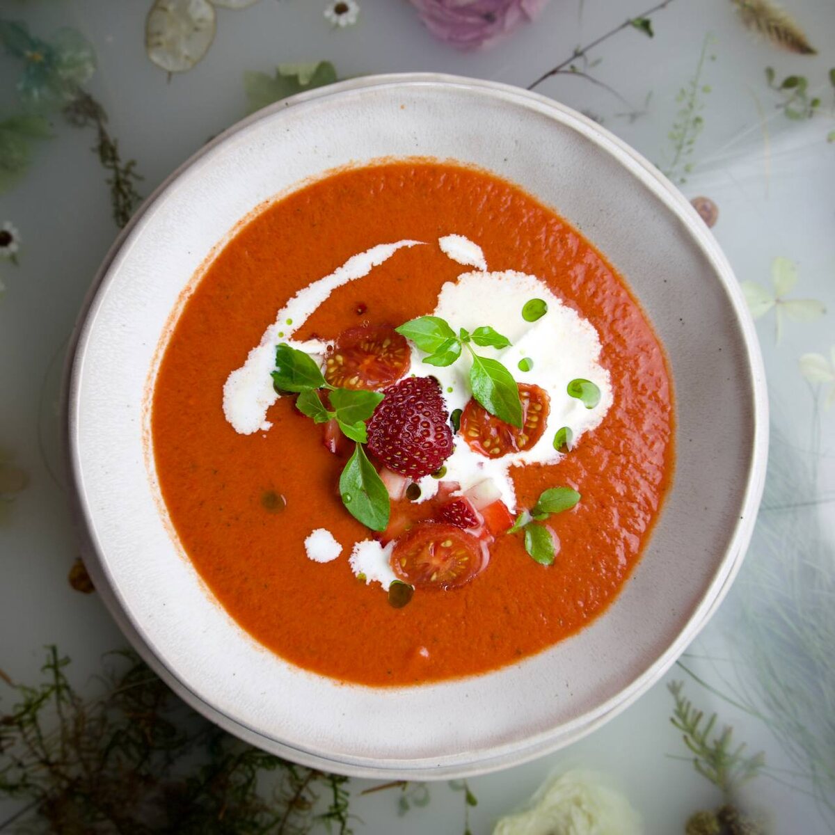 На финальном этапе можно добавить сливочный сыр страчателла и несколько кусочков свежей клубники. Ягоды добавляют легкую нотку свежести, однако их количество не должно перебивать основной вкус супа — достаточно одной-двух ягод. Готовое блюдо следует украсить листиками базилика, что подчеркнет его аромат и визуальную привлекательность.