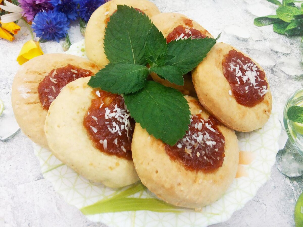 Наполнить каждый кружочек повидлом и выложить на противень, застеленный пергаментом. Если хотите, сверху посыпать кокосовой стружкой.