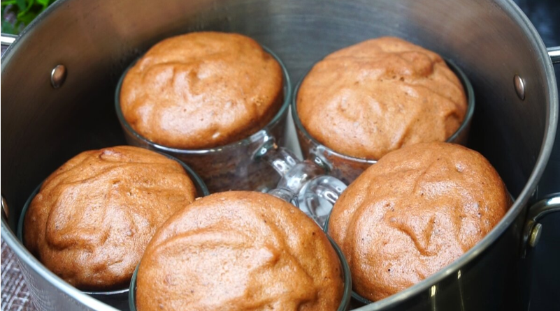 5. В большую кастрюлю положите тряпочку для создания паровой подушечки, установите кружки внутри и накройте кастрюлю полотенцем с крышкой. Готовьте на среднем огне 25-30 минут после закипания.