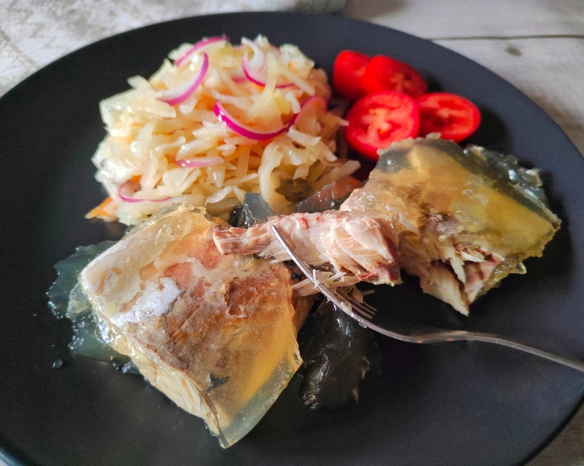 Подавайте готовую скумбрию с отварной картошкой, грибами или квашеной капустой. Важно: не ставьте горячие гарниры рядом с желе, чтобы избежать его растекания.