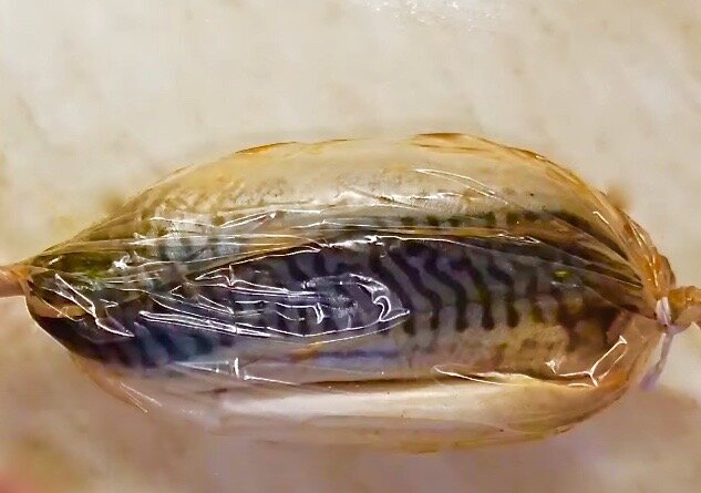 4. Отрежьте один метр рукава для запекания, разрежьте его пополам и выложите скумбрию в один слой, слегка перекрывая друг друга.