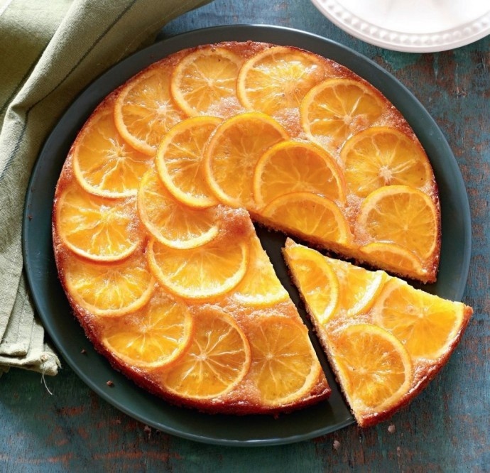 Проткните пирог по поверхности зубочисткой и смажьте апельсиновым сиропом. Дайте остыть до комнатной температуры, затем вынимайте пирог из формы и выкладывайте на блюдо.