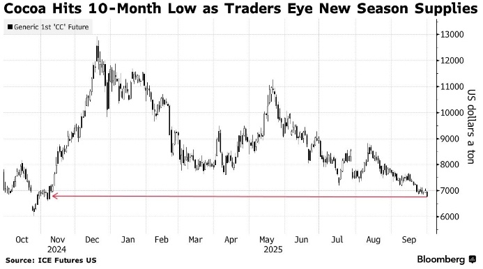 Цены на какао в Нью-Йорке достигли самых низких уровней за десять месяцев, что связано с ожидаемым увеличением поставок в новом сельскохозяйственном сезоне. Начало сбора урожая в Кот-д’Ивуаре, крупнейшем производителе какао в мире, запланировано на 1 октября и ожидается, что это значительно повысит экспортные объемы, которые в последнее время сократились.