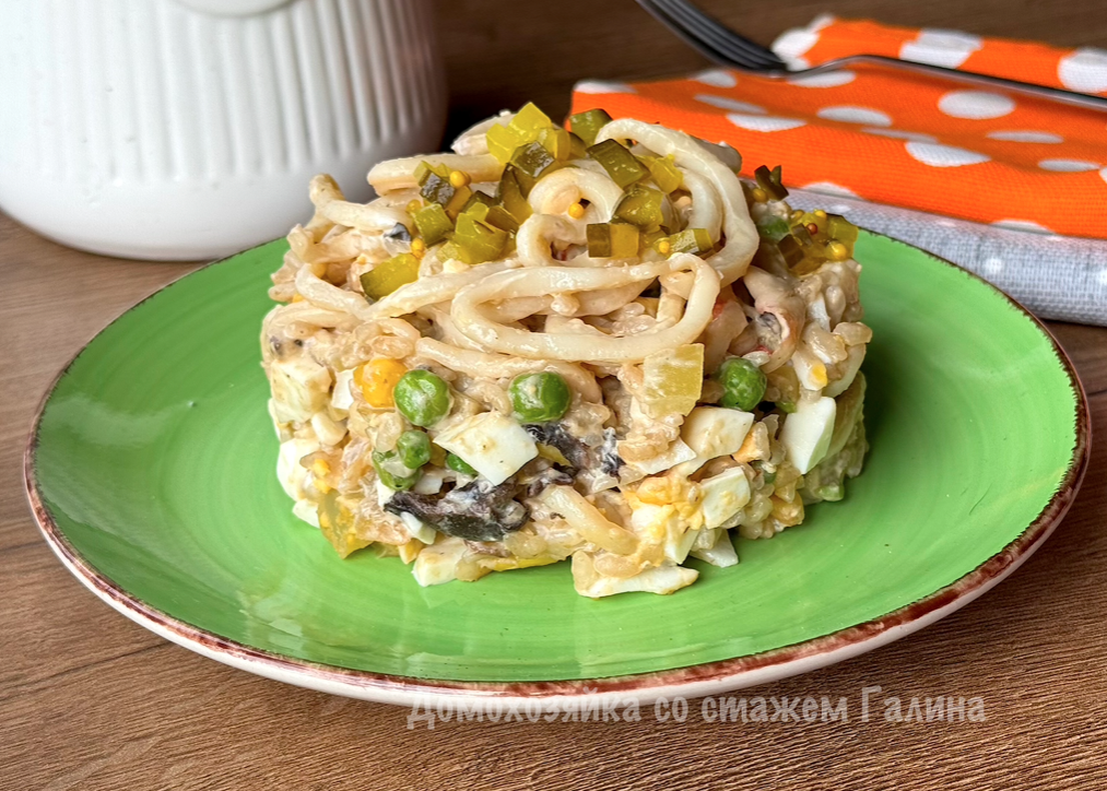 Овощную массу с рисом прогрейте без масла до полного испарения жидкости, затем переложите в салатник для остывания. После этого добавьте нарезанные вареные яйца и охлажденные кальмары. Для дополнительного аромата подойдёт самодельный огуречный релиш или маринованные огурцы. Заправьте салат майонезом и слегка посолите.