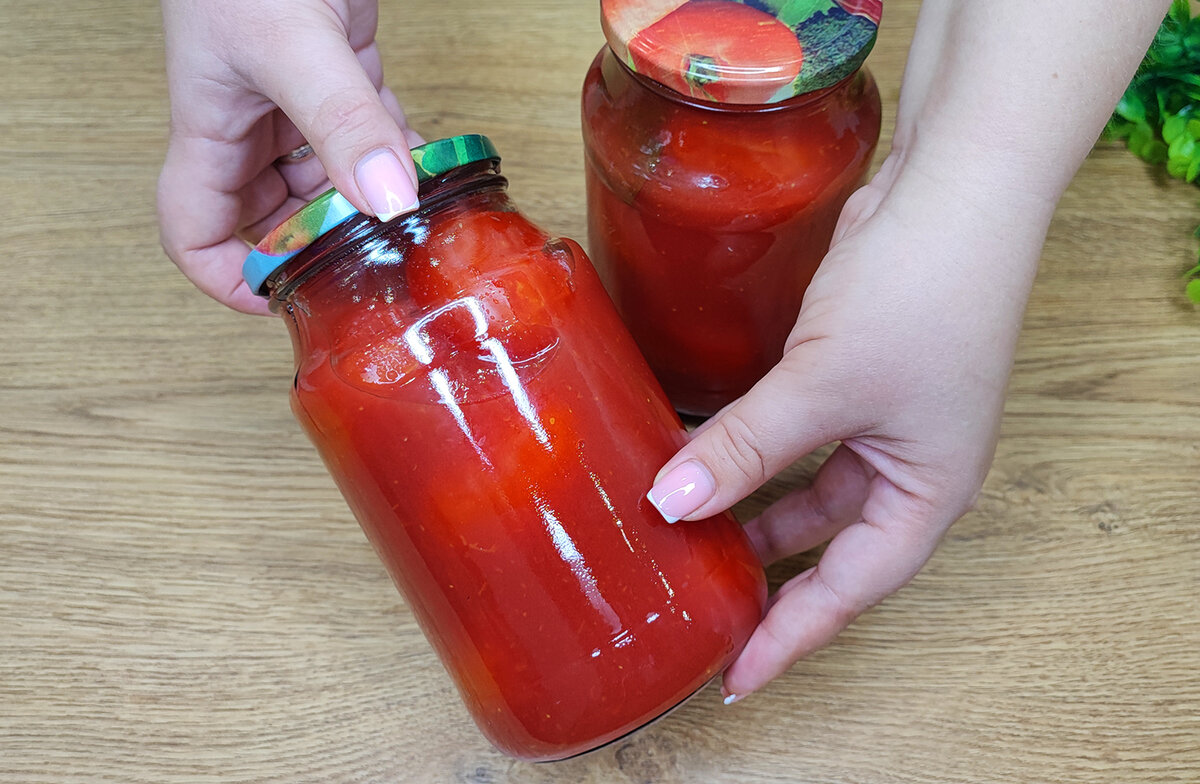 5. Сливаем воду из банок и заливаем их горячим томатным соком. Плотно закрываем крышками, переворачиваем банки и укутываем их теплым одеялом до полного остывания.