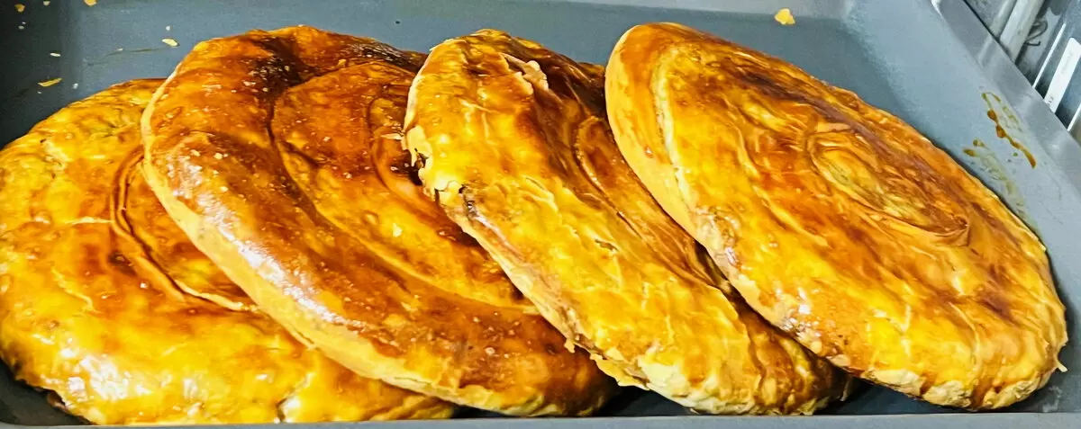 Тесто делится на четыре части, каждая из которых скатывается в колобок и раскатывается в тонкий пласт. Половину пласта смазывают растительным маслом, складывают пополам, выкладывают начинку и аккуратно заворачивают в рулет, формируя улитку. После этого тесто нужно оставить на некоторое время, а затем раскатать в лепёшку. Выпекайте в предварительно разогретой духовке при 180 градусах на протяжении 35-40 минут. И вот, на ужин подаётся великолепная выпечка!