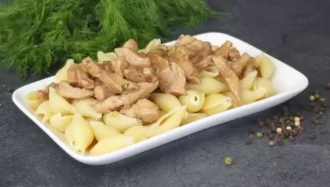 Накройте сковороду крышкой и тушите в течение 15 минут на среднем огне. Тем временем можете поставить воду для макарон и отваривайте их, следуя инструкции на упаковке. Как только макароны готовы, куриная грудка также будет готова и блюдо можно подавать на стол.