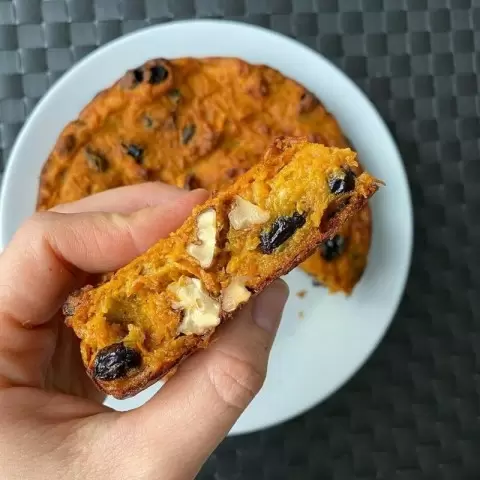 1. Натереть морковь на мелкой терке. В отдельной миске смешать фруктовое пюре, яйцо, растительное масло, орехи и изюм.
