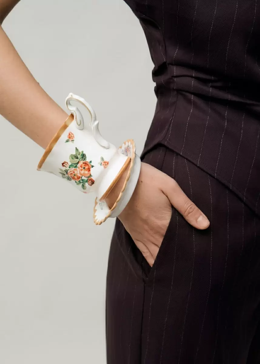 Основное внимание привлекает браслет-манжета, выполненный в форме чайной чашки с изысканными розами. Его цена составляет около 50 000 рублей. В дополнение к этому аксессуару, дизайнеры предложили браслет-ободок без застежки, который напоминает блюдце. Его стоимость — примерно 40 000 рублей. Эти браслеты идеально подойдут для тех, кто желает добавить стильный акцент в свой образ.