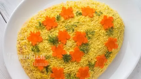Салат Мимоза в виде пасхального яйца выглядит эффектно и очень аппетитно, что станет отличным дополнением к любому праздничному столу.