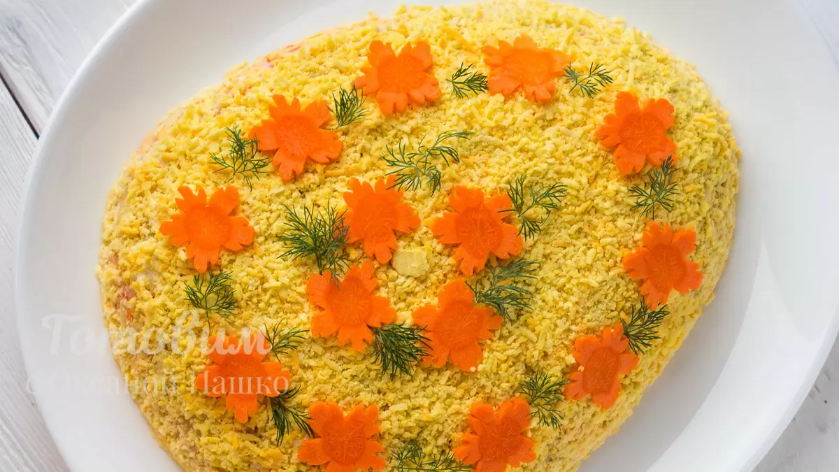 9. Для украшения вырезаем из моркови лепестки и делаем надрезы, чтобы получились цветы, которые затем размещаем на салате.