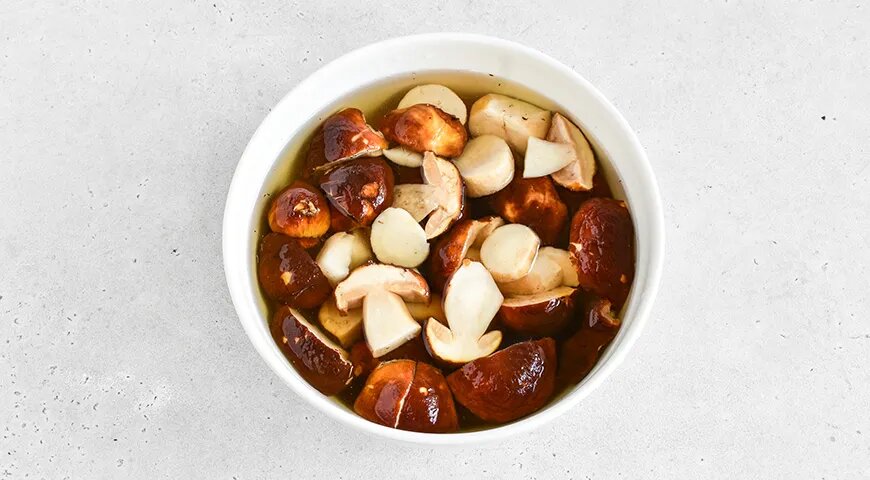 1. Подготовка грибов. Свежие белые грибы тщательно очищаются и нарезаются на кусочки размером примерно 2-3 см. Затем их заливают холодной водой и оставляют на 30-60 минут для того, чтобы избавиться от возможного мусора. Воду сливают, а грибы тщательно обсушивают.